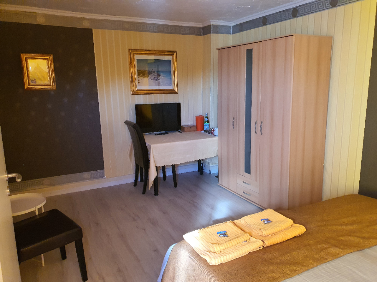 20 qm, Bett 140 cm Breite, Fernseher mit DVB-T, W-LAN DSL, Seife, weiche Handtücher, Bettwäsche, eine große Flasche Wasser, sicher abschließbares Zimmer, Informationsmappe, Dusche und Toilette auf dem Flur.